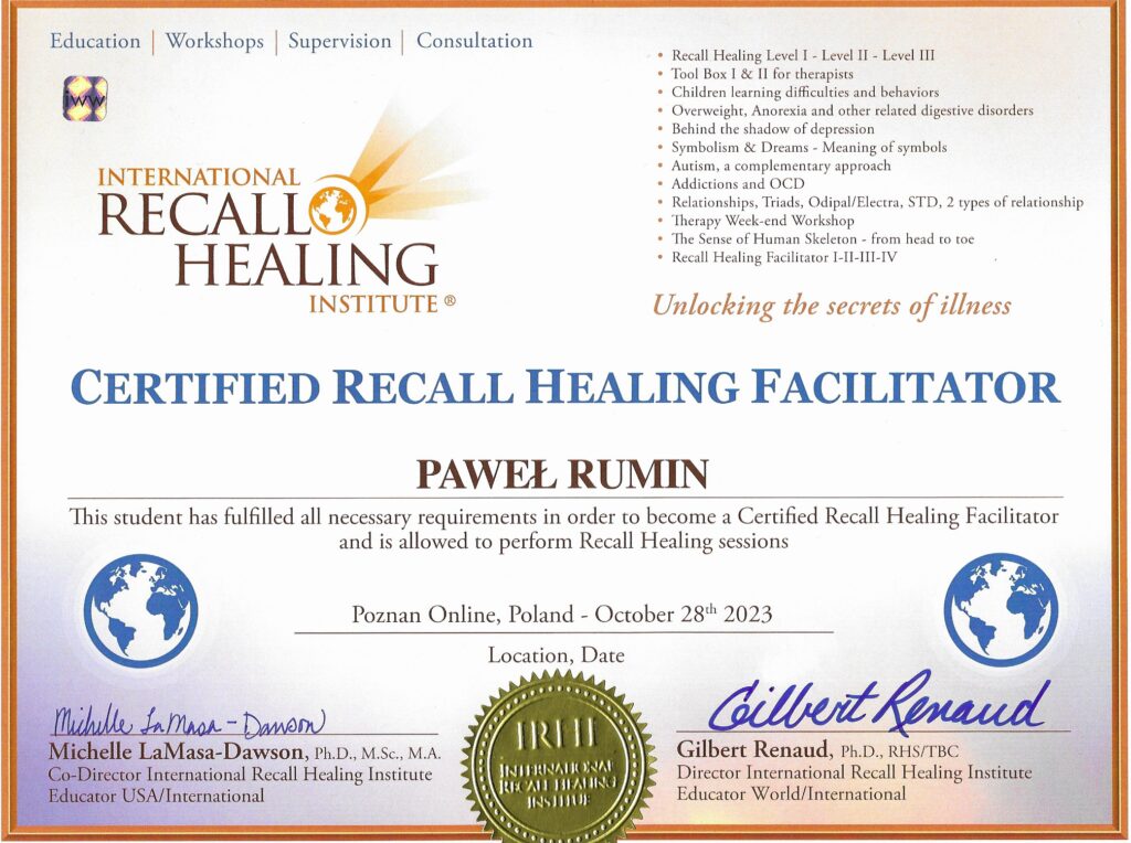 Nazywam się Paweł Rumin i ukończyłemMiędzynarodowy Instytut Totalnej Biologii® i jestem certyfikowanym facylitatorem metody.